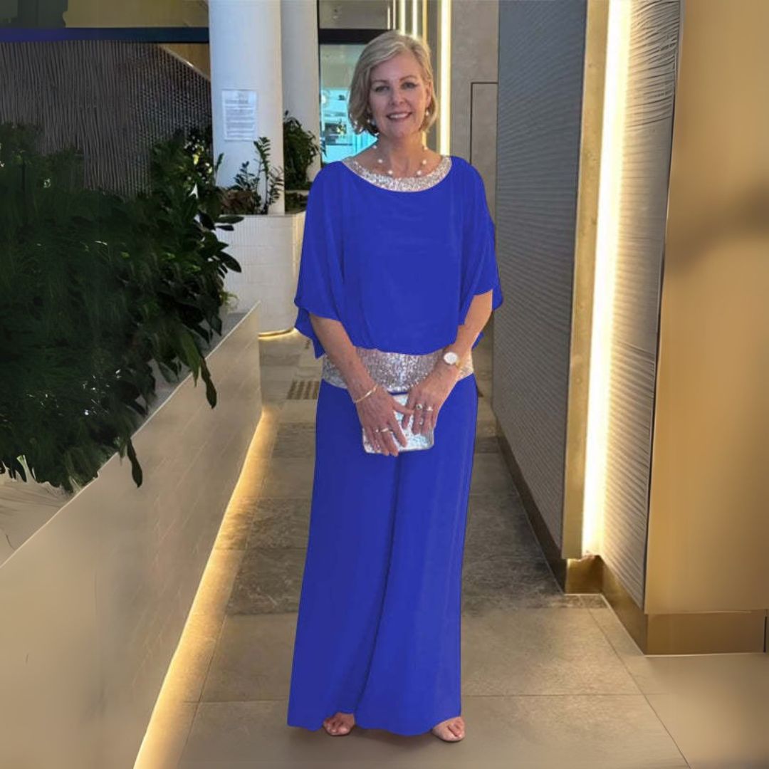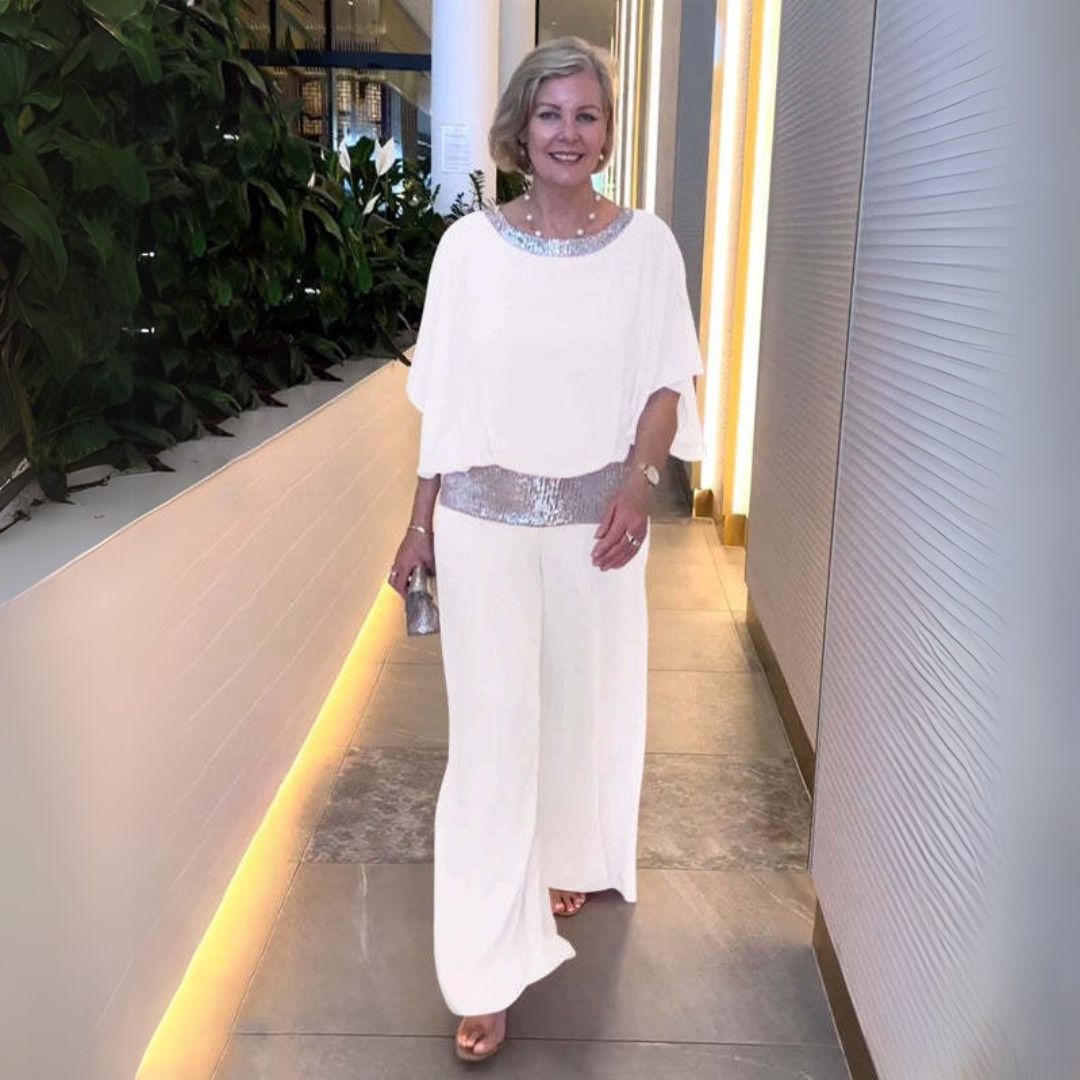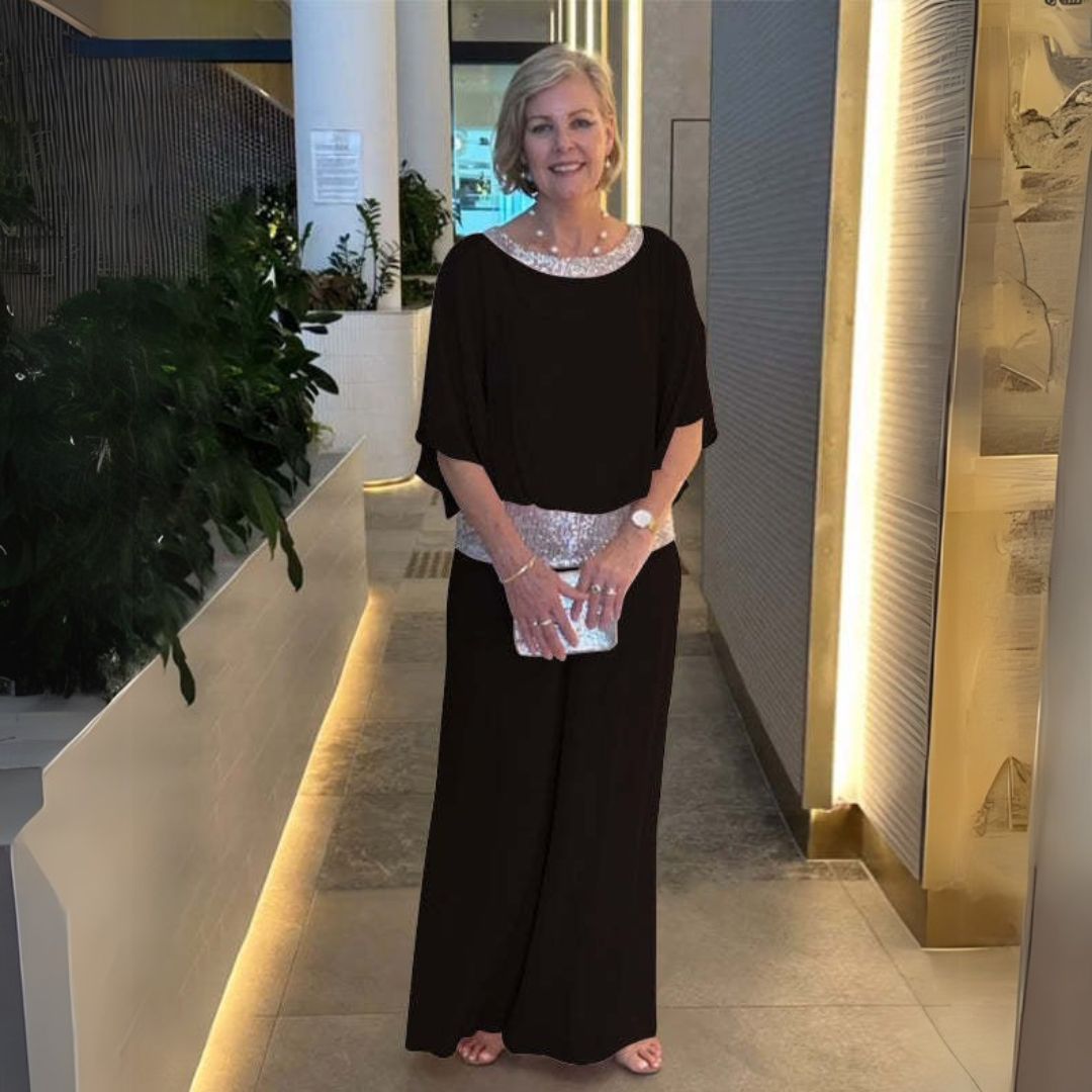 Este conjunto de dos piezas brillante combina elegancia y comodidad. Confeccionado con materiales de alta calidad, ofrece un aspecto lujoso y una sensación suave en la piel. Perfecto para ocasiones especiales como fiestas, cenas o veladas.