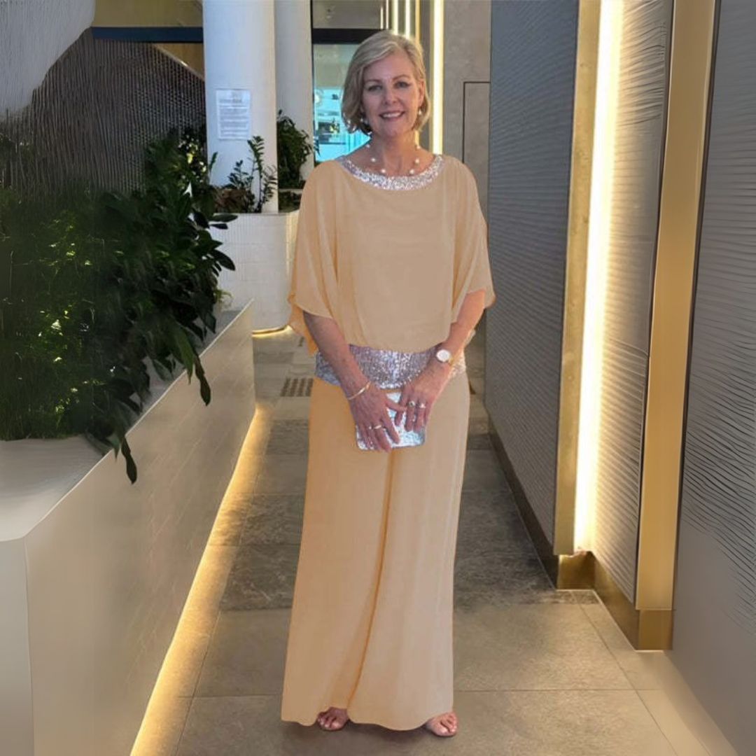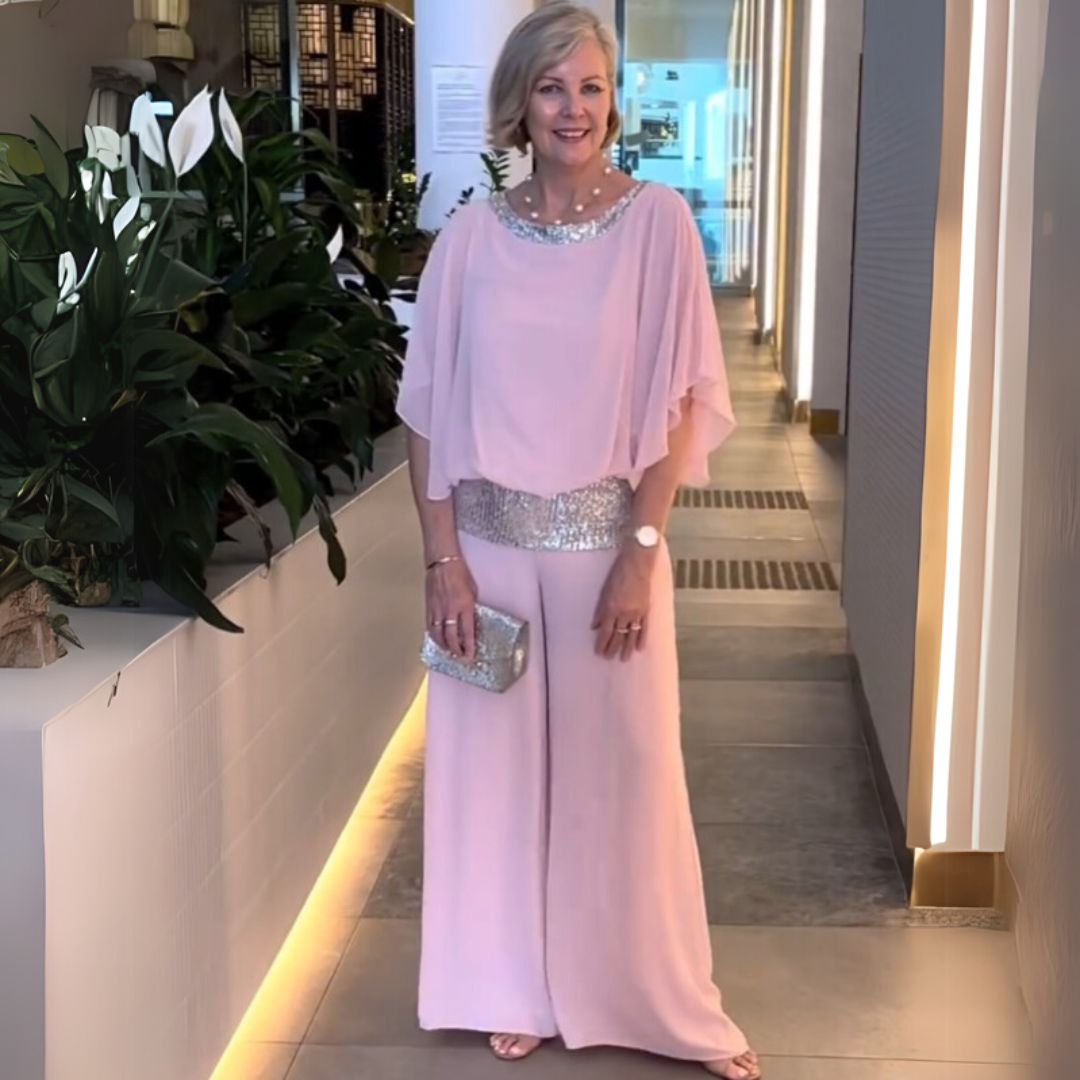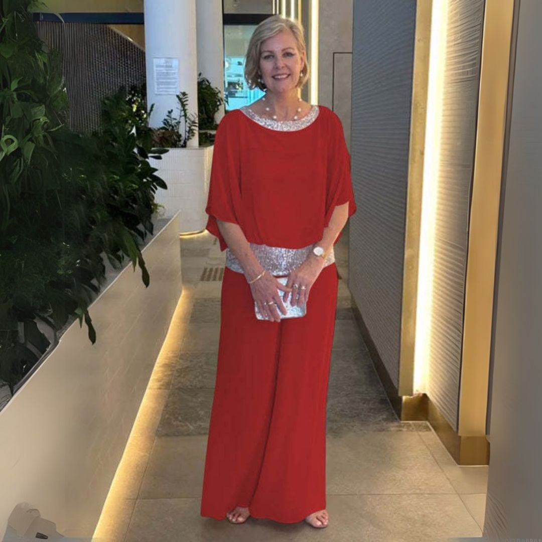 Este conjunto de dos piezas brillante combina elegancia y comodidad. Confeccionado con materiales de alta calidad, ofrece un aspecto lujoso y una sensación suave en la piel. Perfecto para ocasiones especiales como fiestas, cenas o veladas.